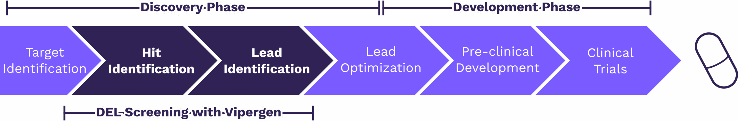 Figure 1: Overview of the drug discovery and development process. Vipergen’s medicinal chemistry services support hit identification and lead identification by combining DEL screening, sequencing/informatics analysis, series nomination, and rapid off-DNA resynthesis—enabling faster confirmation and cleaner handoff into downstream hit-to-lead activities.