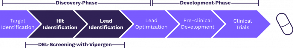 Vipergen was founded to provide exactly that service as a medicinal chemistry company whose platform is built around the synthesis and screening of DELs. We focus on the initial part of the drug discovery pipeline (figure 1) and can take your target protein of interest (POI) to early lead like compounds in a few months. Hereby Vipergen’s medicinal chemistry platform can help to deliver the greatest impact and the highest return of investment. By concentrating our resources on DEL construction, selections, data analysis, and hit re-synthesis, we offer a streamlined medicinal chemistry service that plugs directly into your discovery engine – no matter whether your downstream chemistry is handled in-house or by another medicinal chemistry CRO.