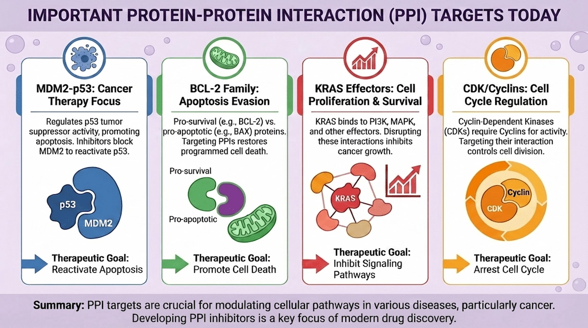 A frequent “druggable PPI” pattern is an amphipathic helix docking into a groove (e.g., BCL-2 family, MDM2/p53). These are often more pocket-like and have produced multiple clinical-stage ligands. [7–9]
