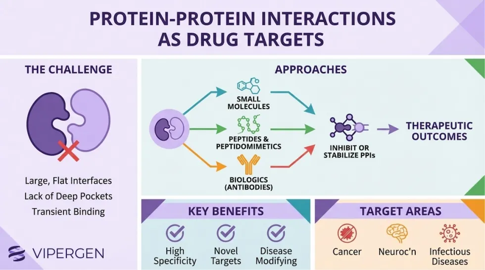 PPIs are not “special cases” – they are the default mechanism by which cells build functional machines. Enzymes often act in complexes; transcription factors recruit co-activators and repressors; kinases dock to scaffolds; ubiquitin ligases recognize substrates via protein interfaces. The clinical relevance is straightforward: if a disease state depends on a pathologic interaction, modulating that interaction can be as direct and causal as inhibiting an enzyme active site.