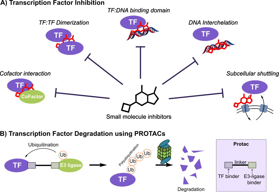Figure 1: Different ways for small molecule transcription factor inhibition. A) Traditional ways for small molecule transcription factor inhibition and B) Transcription factor inhibition by PROTACs